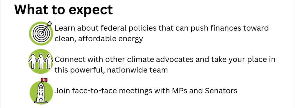 We’re gearing up for a powerful Federal Environment Week in June, and we want you to be part of it. Why, after all these years, are we still fighting to transform our economy away from fossil fuels? We know that nearly 90% of people want action on climate , yet bad-faith actors—backed by the fossil fuel industry—continue to distort public opinion on social media, creating a false perception of opposition. But we have good news: we still have time to act. But how? Last December, Senator Rosa Galvez joined us to discuss her Climate Aligned Finance Act—a nation-building bill for the 21st century. This is the kind of bold leadership we need, and we’re here to make sure it happens. In January, Simon Sharpe showed us how we can accelerate this transformation five times faster. The key now is to ensure our MPs understand that their constituents demand federal policies to redirect finances away from fossil fuels. As constituent lobbyists, we’ll guide you every step of the way. Whether you’re new to advocacy or a seasoned activist, we’ll provide the support you need to lobby your MP effectively. We hope you can join us. Before registration officially opens in late April, we invite you to take the first step: Monday, June 1, 2026 Tuesday, June 2, 2026 Wednesday, June 3, 2026 In May, our last three Climate Leader Launch Pads on Wednesdays will be dedicated to helping people to get ready to lobby in June on our Climate Leader Launchpad In May, there will be other time slots to help prepare to lobby too. So keep checking back here. If you come to Ottawa to lobby with us, there will be training and lobby preparation on Monday, June 1 in the evening. Then, you will be surrounded and supported by people who unconditionally giving for the greater good, some since 2010. This is probably our 29th time going to lobby our MPs as a collective (we are losing count). Phone and then email your MPs to let them know you plan to meet with them during the CCL Canada’s lobbying days or in your home riding. Draft a “Getting Ready to Lobby” document in Word to share before booking your appointment. Even a draft is fine—please get it started. (See Lobbying Resources for what that means) Register your appointment. Introduce yourself as a constituent in [insert name of your riding]. Express authentic appreciation for something the MP has done recently. Introduce Citizens’ Climate Lobby (CCL) Canada: Let them know that June 1-3, CCL volunteers from across the country will be meeting with Parliamentarians to hear their thoughts on shared goals for tackling the climate crisis. Mention you would like to schedule a meeting during these days or if you are lobbying from your home riding when they are back in town. Inform the staff you will follow up by email to confirm the date, time, and meeting details including the lobbying asks. Ask for the best email address for the staffer. Thank them for their time. Replace text in brackets and customize to your circumstances. Subject: Meeting Request – Citizens’ Climate Lobby Canada Dear [Title and Name of Parliamentarian], I am a constituent of yours in [your riding]. I volunteer with Citizens’ Climate Lobby Canada (CCL), a non-partisan, volunteer-led, grassroots advocacy organization that supports evidence-based climate policies. With over 40 active chapters across Canada, representing more than 120 ridings, CCL has been focused on advocating for effective climate solutions since its inception in 2010. From June 1-3, CCL volunteers from across the country will be meeting with Parliamentarians to hear their thoughts on Canada’sshared goals for addressing the climate crisis. We would greatly appreciate a meeting with you to hear your views and explore how we can work together. Specifically, we would like to discuss [insert your chosen CCL lobbying asks(s)]. If you could respond by [pick a date that makes sense] that would help us immensely in our planning and I will follow-up soon after that date if I not heard from you. We understand your office is very busy and happy to work around your schedule. My fellow constituents and I are looking forward to the opportunity to introduce ourselves and get to know you. Kind regards, More resources On Tuesday, April 14, our monthly educational call is an Introduction to Motivational Interviewing with Vince Schutt. It is designed to sharpen your communication and advocacy skills. This training is free for all CCL members. If you’d like to show your appreciation, donations can be made to CCL Canada, as requested by Vince. What to Expect: How to Sign Up: Don’t miss this opportunity to build your skills and connect with fellow advocates. Let’s make our lobbying efforts as powerful as possible—together! IMPORTANT: Note that we are not hosting this event in a hotel. Thus, we can’t offer reduced hotel rates or a guaranteed block of rooms. This is one of the busiest times of the year for visiting Ottawa. It is critical to book your accommodations as soon as you commit to attending the conference. University Ottawa – the closest. The University of Ottawa Summer residences are inexpensive, walkable and you can catch the O-train from campus to Parliament Hill. Note, Mary Blake is staying at 90 University. Courtyard Marriott East – 12 minute walk to Tremblay Station and then an 10-minute O-train ride to Parliament Hill. Ottawa Jail Hostel – Very inexpensive and group rates available. The closest to Parliament Hill. Note for those attending:Join Us in Shaping a Liveable Future