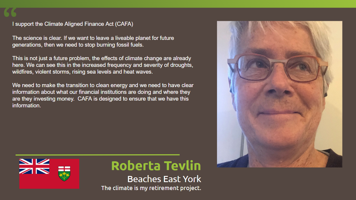 Since March 2022, Citizens’ Climate Lobby Canada has collaborated with Senator Rosa Galvez and over 120 civil society organizations to align Canada’s financial system with the urgent realities of the climate crisis. On December 10, 2025, Senator Galvez provided an update on the Climate-Aligned Finance Act (CAFA), reintroduced in October 2025 as Senate Bill S-238. This legislation is a critical step toward ensuring Canada’s financial flows support climate action and a just transition. To build political will for CAFA, we formed a national action team. Currently, over two dozen pods of members from Citizens’ Climate Lobby Canada and Grand(m)others Act to Save the Planet are actively securing appointments with key senators to advance this agenda. Together, we are clearing the path for climate-aligned finance regulations in Canada. This page serves as a resource hub for our members and allies, offering tools, updates, and ways to engage. Upcoming Advocacy: June 1-3 we will be in to Ottawa to lobby for CAFA. Stay tuned for opportunities to participate or support our efforts either in person or virtually. Note there is an entire Google Drive to this lobbying effort. You have to be on the team to access them. This paper petition if for the House of Commons Climate Aligned Finance Act Parliamentary Petition Government resources: For Further Information Instructions: Hand-deliver or send the original copy of the petition to: YOUR MP’S NAME No stamp is required for Parliament in Ottawa. If your MP does not want to read the petition, you can send it to other MPs who will. Follow up by asking when it will be read in Parliament, how it was received and a big thank you via snail mail, email, and social media. Please inform us in your monthly Citizens’ Climate Lobby Action Report if your petition has been read aloud in the House of Commons. It is considered to be outreach. By informing the national office we can thank them on Twitter and Facebook. Cabinet Ministers are not permitted to read petitions in the House of Commons as it would constitute a “conflict of interest”. Thus if your MP is a cabinet Minister you should inform him/her about the petition and ask if he or she could suggest another MP from your province who might read the petition instead. WE DID IT! PARLIAMENTARY E-PETITIONS These are the official e-petitions that are read in the House of Commons. Online parliamentary petitions and any online petition are a lot of work. Here are the steps to go through to get one considered by our network. For Valentines Day 2026 we created postcards to support the Climate Aligned Finance Act. We have changed the back of the card so that you can use them year round. Note the back of the cards do not reference Valentine’s Day. Printing instructions: Signing the postcards: Who to send the postcards to? And two of the three cards are for all Parliament, so feel free to include MPs in your region, the Prime Minister, the Finance Minister, and MPs on these committees: Coming soon,Lobbying Resources