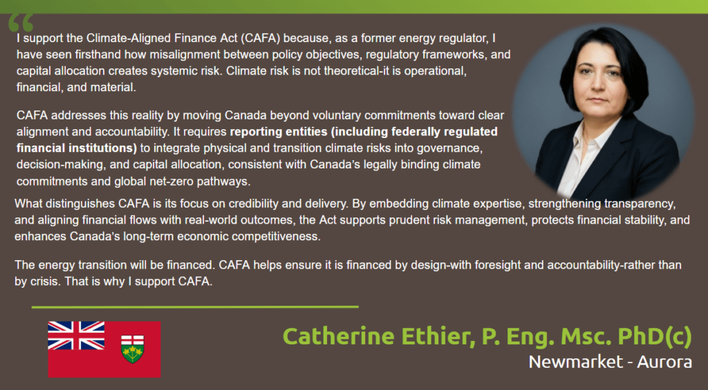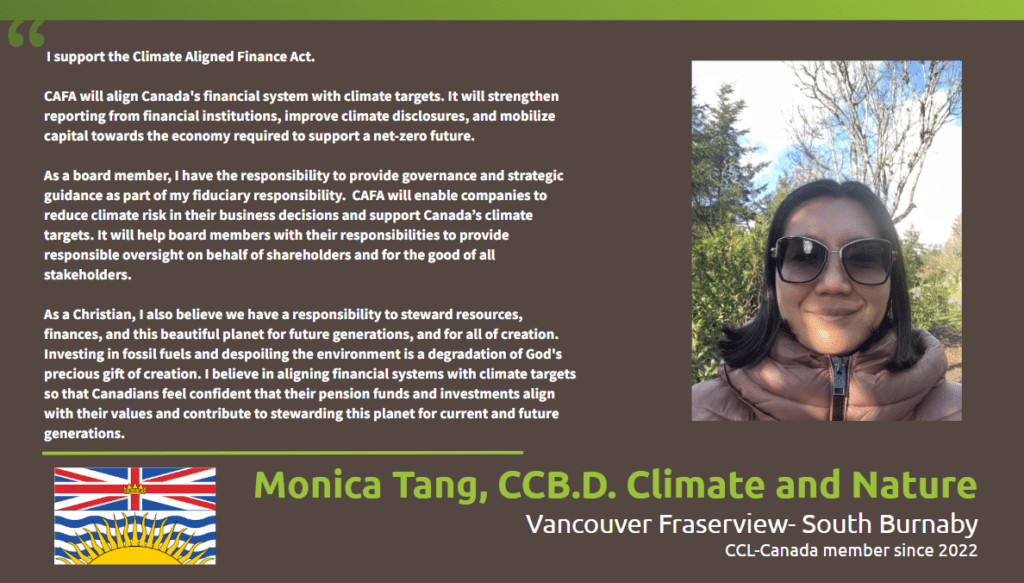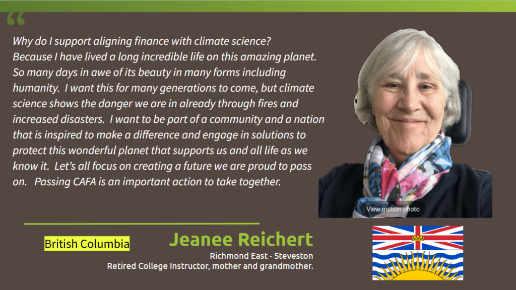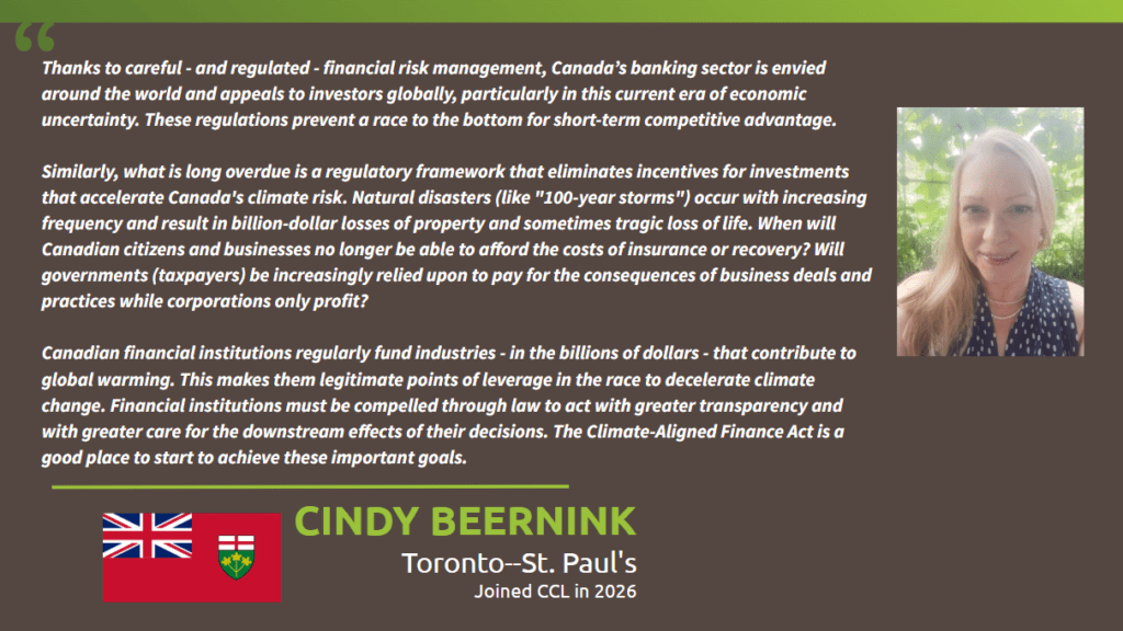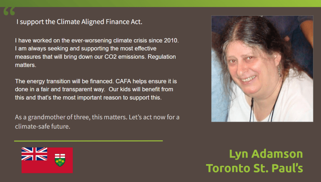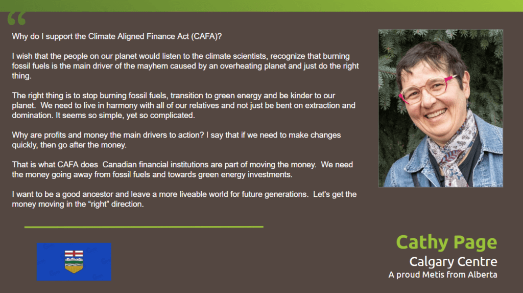 Since March 2022, Citizens’ Climate Lobby Canada has collaborated with Senator Rosa Galvez and over 120 civil society organizations to align Canada’s financial system with the urgent realities of the climate crisis. On December 10, 2025, Senator Galvez provided an update on the Climate-Aligned Finance Act (CAFA), reintroduced in October 2025 as Senate Bill S-238. This legislation is a critical step toward ensuring Canada’s financial flows support climate action and a just transition. To build political will for CAFA, we formed a national action team. Currently, over two dozen pods of members from Citizens’ Climate Lobby Canada and Grand(m)others Act to Save the Planet are actively securing appointments with key senators to advance this agenda. Together, we are clearing the path for climate-aligned finance regulations in Canada. This page serves as a resource hub for our members and allies, offering tools, updates, and ways to engage. Upcoming Advocacy: June 1-3 we will be in to Ottawa to lobby for CAFA. Stay tuned for opportunities to participate or support our efforts either in person or virtually. Note there is an entire Google Drive to this lobbying effort. You have to be on the team to access them. This paper petition if for the House of Commons Climate Aligned Finance Act Parliamentary Petition Government resources: For Further Information Instructions: Hand-deliver or send the original copy of the petition to: YOUR MP’S NAME No stamp is required for Parliament in Ottawa. If your MP does not want to read the petition, you can send it to other MPs who will. Follow up by asking when it will be read in Parliament, how it was received and a big thank you via snail mail, email, and social media. Please inform us in your monthly Citizens’ Climate Lobby Action Report if your petition has been read aloud in the House of Commons. It is considered to be outreach. By informing the national office we can thank them on Twitter and Facebook. Cabinet Ministers are not permitted to read petitions in the House of Commons as it would constitute a “conflict of interest”. Thus if your MP is a cabinet Minister you should inform him/her about the petition and ask if he or she could suggest another MP from your province who might read the petition instead. WE DID IT! PARLIAMENTARY E-PETITIONS These are the official e-petitions that are read in the House of Commons. Online parliamentary petitions and any online petition are a lot of work. Here are the steps to go through to get one considered by our network. For Valentines Day 2026 we created postcards to support the Climate Aligned Finance Act. We have changed the back of the card so that you can use them year round. Note the back of the cards do not reference Valentine’s Day. Printing instructions: Signing the postcards: Who to send the postcards to? And two of the three cards are for all Parliament, so feel free to include MPs in your region, the Prime Minister, the Finance Minister, and MPs on these committees: Coming soon,Lobbying Resources