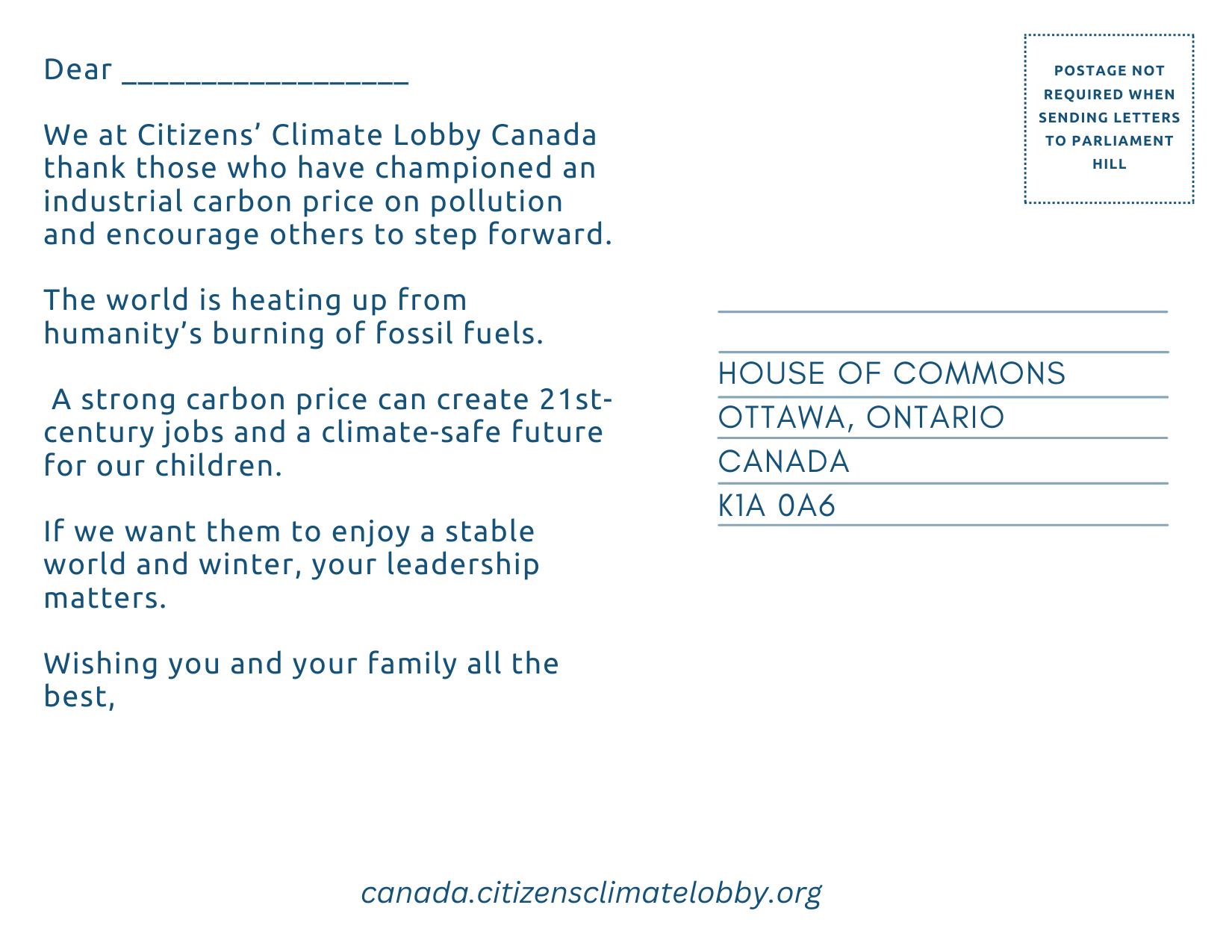 - Note that postage is NOT required for letters and postcards sent to Parliament Hill.