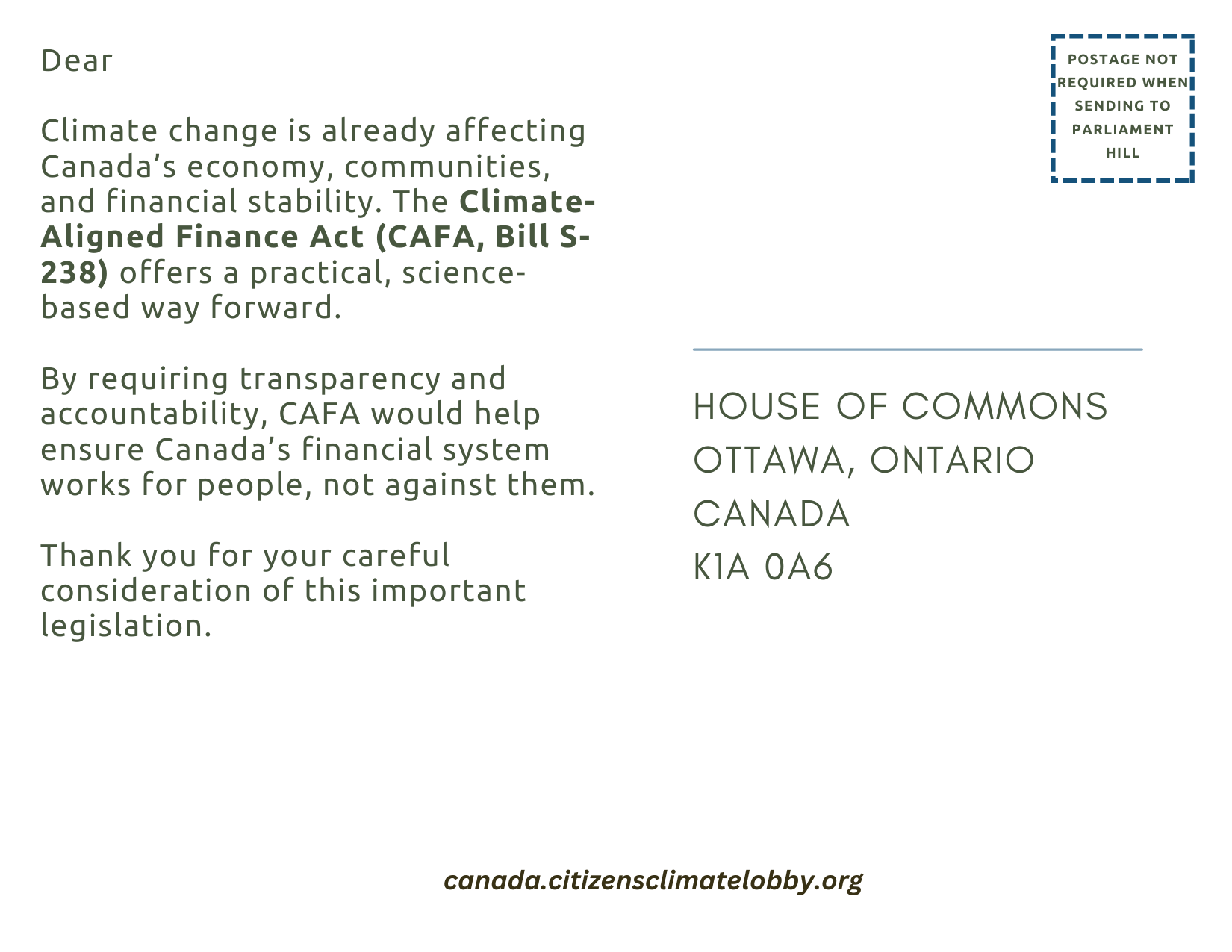 - Be sure to put the name of the parliamentarian on the card in the two places as well as your name, city and postal code. (You can put your full address but there is not a lot of room).