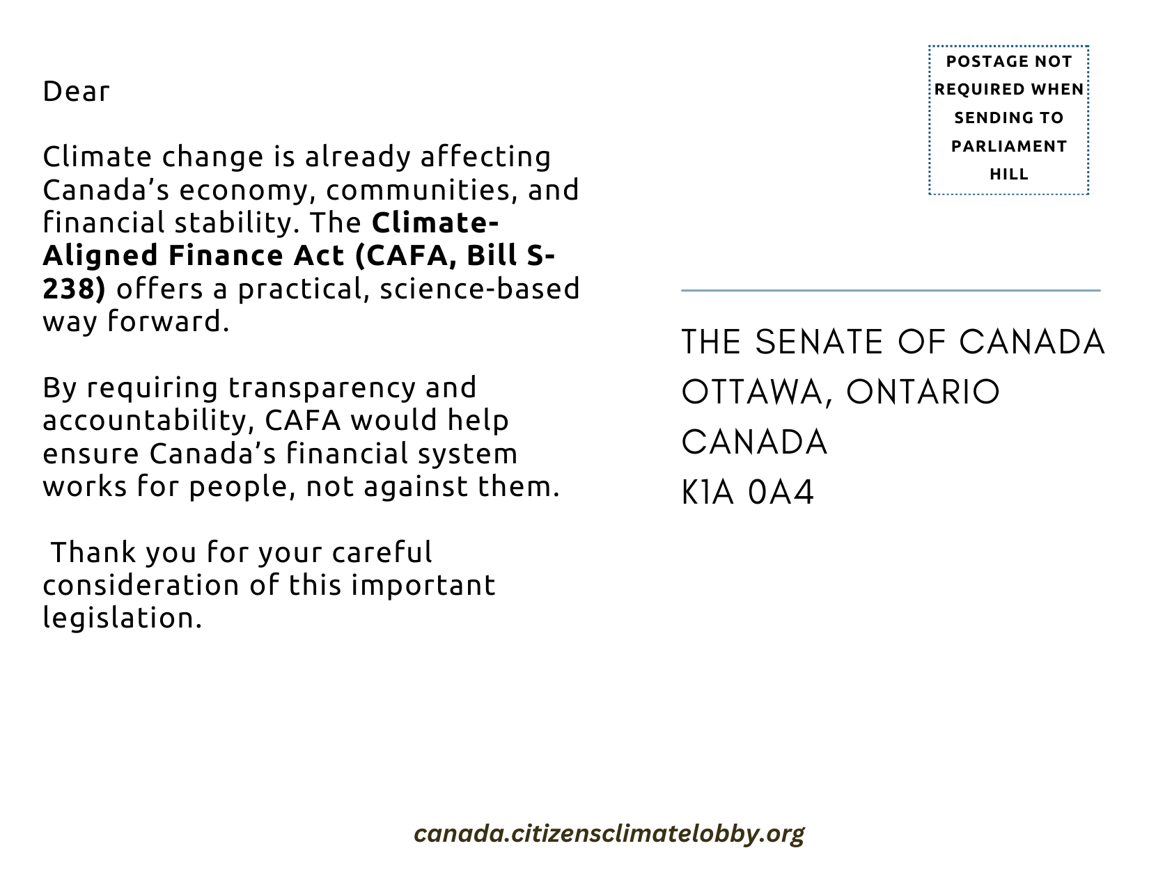 Or edit the images directly in Canva by making a copy in your own account. - There are two postcard backs: one for the Senate and one for the House of Commons.