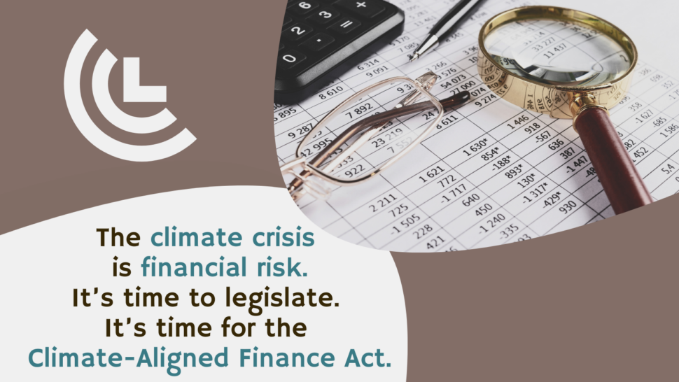 March 12, 2023Join our March education call with Senator Rosa Galvez and learn how the Climate-Aligned Finance Act will redirect financial…