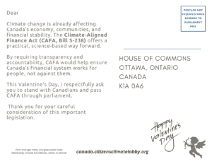 Printing instructions: Signing the postcards: Who to send the postcards to? And two of the three cards are for all Parliament, so feel free to include MPs in your region, the Prime Minister, the Finance Minister, and MPs on these committees: If you wish to work with the image file, right-click on the image, choose save image as and save it onto your computer. Cette carte postale existe en format PDF Previous postcards (February 2015) When you click on the images, each will link to a pdf document that has two images per page. If you wish to work with the image file, right-click on the image, choose save image as and save it onto your computer. For Canada- NO STAMP REQUIRED FOR POSTCARDS TO PARLIAMENT For Nova Scotia – STAMP REQUIRED. (Note the group leaders wanted all Ministers to receive postcards, so a general postcard back was made.) For Ontario – STAMP REQUIRED. For those of you who liked the 2014 Valentines, they can be found here in pdf. Cette carte postale existe en format PDF Valentines Climate Aligned Finance Postcards 2026